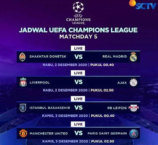 Salam olahraga untuk para penggemar sepak bola di seluruh dunia! Apakah Anda penggemar setia Liga Champions yang tak sabar menyaksikan aksi seru para bintang lapangan hijau dari berbagai klub top Eropa? Kami paham betul bagaimana rasanya ketika jantung berdebar-debar melihat Lionel Messi menggiring bola atau Cristiano Ronaldo melakukan selebrasi gol. Untuk Anda yang tak ingin ketinggalan momen penting ini, informasi tentang jadwal pertandingan Liga Champions yang disiarkan live adalah hal yang wajib Anda ketahui.